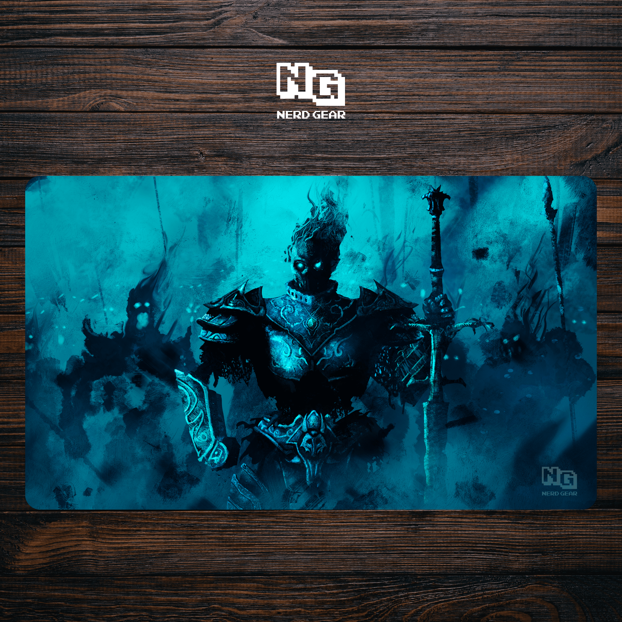 Brace for the eternal winter with this chilling, high-fantasy design. A towering undead knight, clad in ornate armor etched with frost, leads a spectral army through a freezing blue haze. With its piercing blue eyes and a greatsword that looks forged from black ice, this mat is the ultimate choice for Azorius Control, Ice/Snow decks, or Zombie tribal players who want to freeze their opponents out of the game.