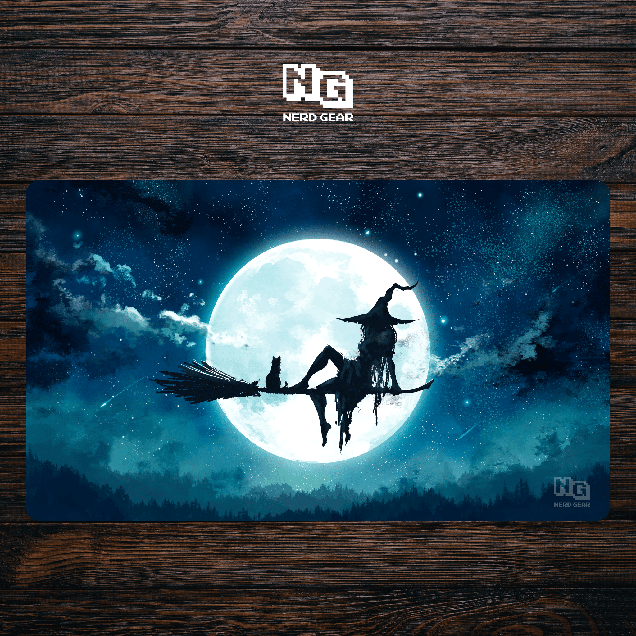 Lunar Vigil Playmat, Witch Silhouette Art, Full Moon TCG Mat, Gothic Fantasy Playmat, Black Cat Art Mat, Blue Mana Gaming Gear, Ethereal Fantasy Decor, Celestial Desk Mat, Sorceress Illustration, Night Sky Gaming Surface, Witchcraft Aesthetic, Stitched Edge Playmat, Dreamscape Art, Wizarding World Vibes, Calm MTG Mat.