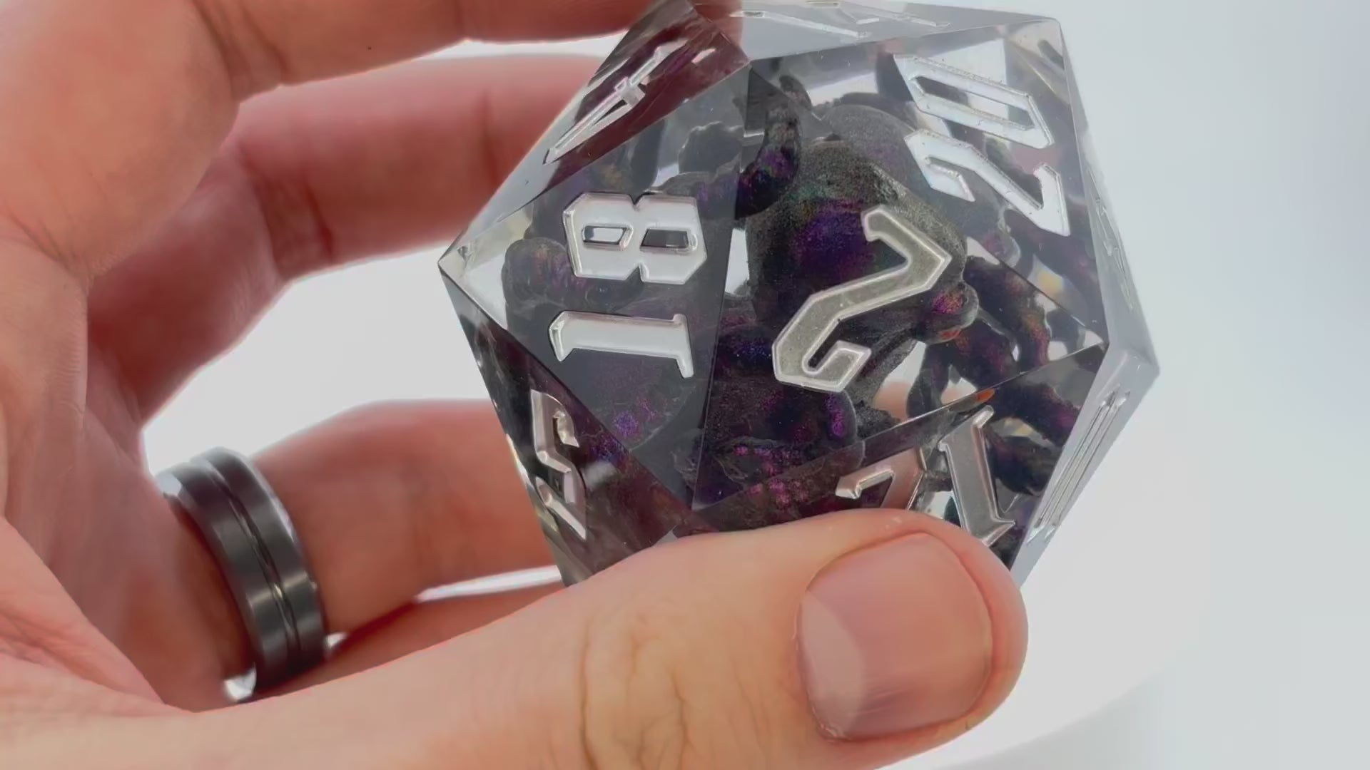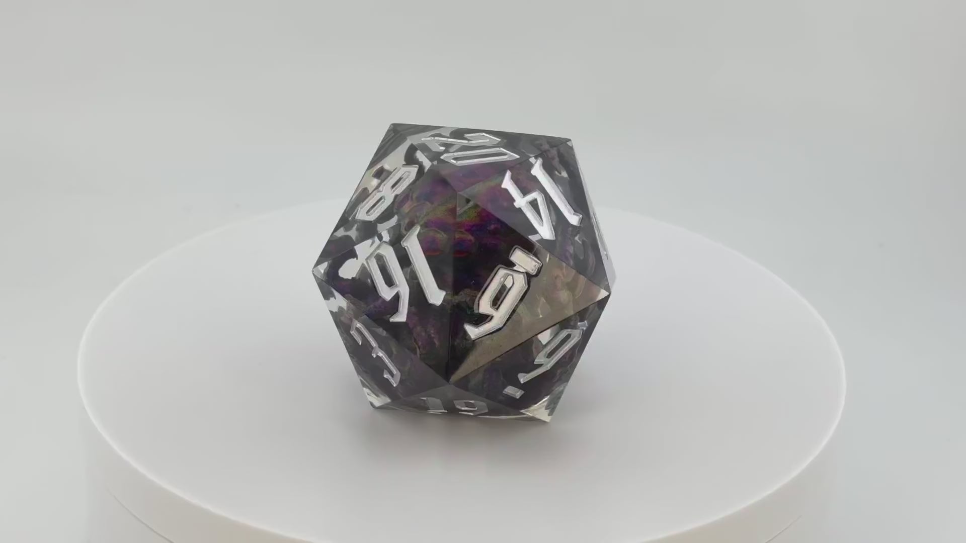 Each die is meticulously hand-poured, polished, and finished to perfection, ensuring exceptional clarity, balanced rolling, and a truly one-of-a-kind collectible worthy of your tabletop legend. The silver inlaid numbers gleam against the dark, galaxy-like resin, catching the light like moonlight on stormy seas.