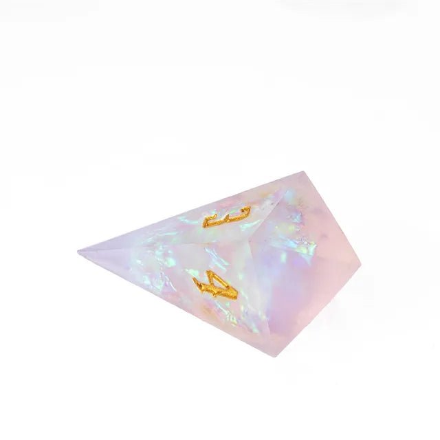 Tap into the light of pure magic with The Aurora Mist dice set. These seven-piece polyhedral dice feature a luminous, white core embedded with Candy Glitter Paper, giving them a stunning iridescent sheen that shifts color in the light—like catching the hazy beauty of the aurora borealis. Each die is meticulously polished to a frosted surface finish, providing a silky-smooth, comfortable grip and an elegant matte look. This set includes a specially changed, spire-shaped D4 for a dramatic roll. With gorgeous gold inlaid numbers, The Aurora Mist set brings an air of elegant mystery and destiny to every check, making them perfect for characters weaving illusion or drawing power from the celestial spheres.
