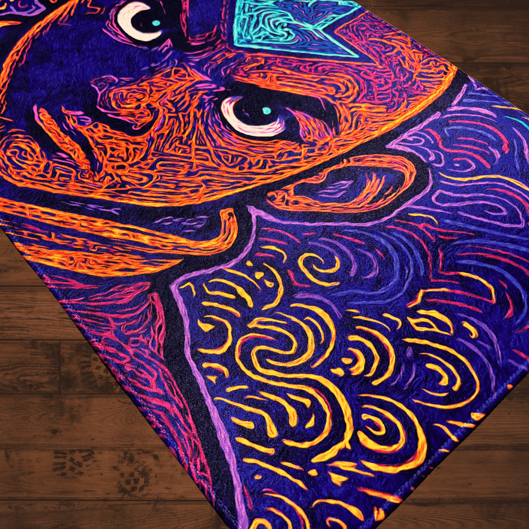 Bring your game table to life with this hand-drawn masterpiece, featuring a bold, high-energy design bursting with color and motion. The vibrant swirls and glowing lines make this playmat an instant showstopper for any card game setup.